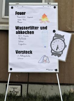 Bei der Ausbildung „Überleben im Gelände“ mussten Teilnehmerinnen und Teilnehmer Feuer machen und damit Wasser zum kochen bringen. Mit dem heißen Wasser galt es anschließend schnellstmöglich zwei Eier zu kochen. Die Schwierigkeit darin lag, dass Feuer ohne Feuerzeug zu entzünden. Mit Hilfe eines selbstgebauten Wasserfilters erlernten die Jugendlichen behelfsmäßig Wasser aufzubereiten. Zum Tagesabschluss stand noch das Überwinden der Hindernisbahn auf dem Programm. Auch hier wurden alle nochmal gefordert. Zuvor gab es eine intensive Einweisung durch das Ausbildungspersonal. Danach wurde jedes Hindernis unter Hilfestellung einzeln überwunden. Dank der Unterstützung von den Profis haben es alle geschafft.