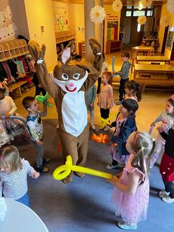 Zum Abschluss der Show gab es für die Kinder bunte Luftballontiere und liebevoll geformte Luftballonherzen für die Erzieherinnen. Als die Kinder sich auf den Weg zurück in die Gruppen machten, entdeckten sie an einigen Garderobenplätzen und in den Gruppen Osterkörbchen, die mit vielen kleinen Überraschungen gefüllt waren. Wer mag wohl die kunterbunte Überraschung dort versteckt haben? Die Freude war riesig, doch bislang hatten die Kinder den Osterhasen noch nicht entdeckt – er ließ es sich jedoch nicht nehmen, allen noch kurz persönlich Hallo zu sagen.