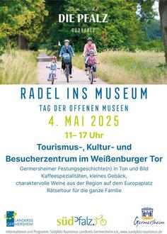 Der kostenlose Flyer „Radel ins Museum 2025“ steht im Internet unter https://www.suedpfalz-tourismus.de/de/suedpfalz-erleben/rad-land-suedpfalz/aktionstag-radel-ins-museum zum kostenlosen Download zur Verfügung oder kann beim Südpfalz-Tourismus Landkreis Germersheim e.V. unter info@suedpfalz-tourismus.de sowie bei den Tourismusbüros und Verbandsgemeindeverwaltungen im Landkreis Germersheim ebenso wie die kostenlose Radkarte Südpfalz angefordert werden. Für alle, die die Museen im Landkreis Germersheim unabhängig vom Aktionstag entdecken möchten, gibt es die interaktive „Radel ins Museum – Tour“. Infos dazu gibt es ebenfalls auf o.g. Webseite.