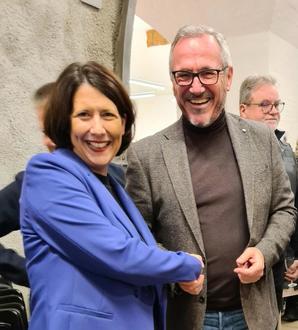 Herzliche Begrüßung zwischen Wirtschaftsministerin Daniela Schmitt und Bürgermeister Marcus Schaile anlässlich der Wiedereröffnung des modernisierten Ausstellungsbereiches im Deutschen Straßenmuseum.