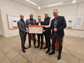 Landrat Martin Brandl vom Kreis Germersheim (2.v.r.) übergab dem 1. Vorsitzenden des Trägervereins Jürgen Menge (Bildmitte) einen Scheck über 10.000 Euro aus der Sparkassenstiftung und würdigte die Bedeutung des bundesweit einzigartigen Museums für den Landkreis Germersheim. Auf dem Bild sind auch der Vorstandsvorsitzende der Sparkasse Südpfalz Svend Larsen (links im Bild), Bürgermeister Marcus Schaile (2.v.l.) und Landrat Dietmar Seefeldt (Südliche Weinstraße), ganz rechts im Bild, zu sehen.