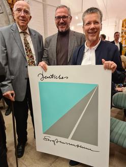 Bürgermeister Marcus Schaile (Bildmitte) zusammen mit Jürgen Menge (1. Vorsitzender des Trägervereins des Deutschen Straßenmuseums) und dem Ehrenmitglied des Trägervereins Hans Dieter Schönborn (links im Bild). In Händen halten sie ein Plakat mit dem Logo des Deutschen Straßenmuseums, welches Hans Dieter Schönborn zur offiziellen Namensgebung des Museums im Jahr 1995 entworfen hatte.