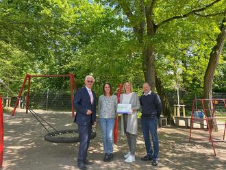 UK RLP-Geschäftsführer Manfred Breitbach überreicht im Mai 2023 Kita-Leitung Beatrice Zehe, der stellv. Kita-Leitung Alexandra Volk sowie Ingo Schöffel, stellv. Geschäftsführer des Prot. Kindertagesstättenverbandes Speyer-Germersheim, den UK RLP-Präventionspreis 2022.