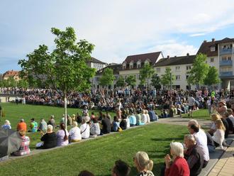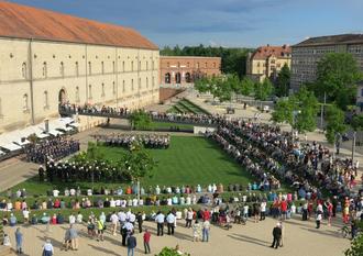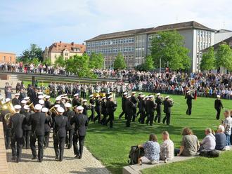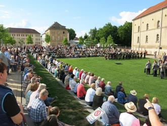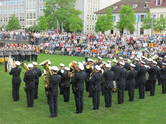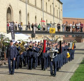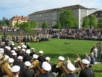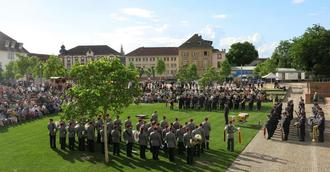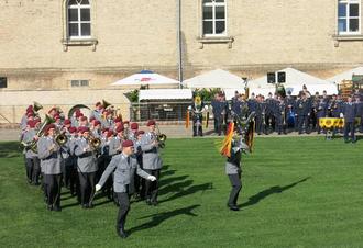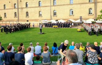 Nacheinander am Paradeplatz angekommen, formierten sich die drei Musikkorps am Paradeplatz auf der Wiese zur Eröffnungsrede des Germersheimer Bürgermeisters Marcus Schaile und anschließendem Platzkonzert unter der Führung von Oberst Thomas Klinkhammer, dem Leiter des Militärmusikdienstes der Bundeswehr.