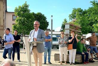Im Anschluss an die fantastische Vorstellung auf dem Germersheimer Paradeplatz bedankte sich Bürgermeister Marcus Schaile in der Stadthalle noch einmal herzlich bei allen Akteuren für diese glanzvolle Eröffnung der Woche der Militärmusik 2024.