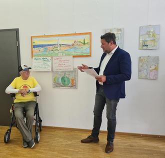 Er beglückwünschte den 88-jährigen Hobbymaler Dieter Marz, der im Caritas-Altenzentrum St. Elisabeth wohnt, zur Ausstellungseröffnung und erzählte davon, dass Dieter Marz viele Jahre gesundheitlich sehr stark angeschlagen war, insgesamt sechs Jahre im Rollstuhl saß und seinen Lebensmut verloren hatte, aber dank liebevoller und tatkräftiger Unterstützung des Personals im Altenzentrum sowie des ehrenamtlichen Betreuungshelfers Tony Tranter-Krstev war es gelungen, Herrn Marz für sein früheres Hobby - das Malen - zu begeistern. Was zunächst als Zeitvertreib begann, wurde schnell wieder zur Leidenschaft.