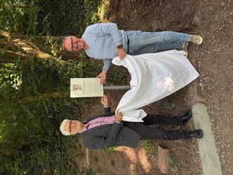 Germersheims Bürgermeister Marcus Schaile (rechts im Bild) und Sondernheims Ortsvorsteher Andreas Müller enthüllten am vergangenen Sonntagnachmittag eine Gedenktafel in Erinnerung an Otto Bügel, der die Marienstätte Zeit seines Lebens mit Hingabe gepflegt hatte. Fotos: SNelles | Stadt Germersheim