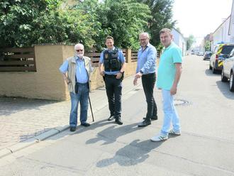 v.l.n.r.: Ortsvorsteher Friedrich Rentschler, Kontaktbeamte der Polizeiinspektion Germersheim André Laubersheimer, Bürgermeister Marcus Schaile und Abteilungsleiter der Ordnungs- und Sozialverwaltung Michael Rheude beim gemeinsamen Vor-Ort-Termin vergangene Woche in Sondernheim. Foto: SNelles I Stadt Germersheim