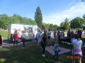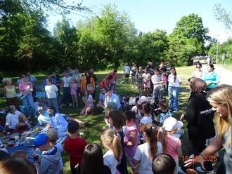 Danach wurde gemeinsam gesungen und getanzt. Beim Lied „Tschu Tschu Wa“ machten alle mit - Kinder, Familien und Erzieherinnen. Bereits zu Beginn des Nachmittags hatten viele Familien ihre Picknickdecken ausgebreitet. Nach dem gemeinsamen Programm wurde ausgiebig gepicknickt - es wurde gegessen, getrunken, gelacht und geredet.