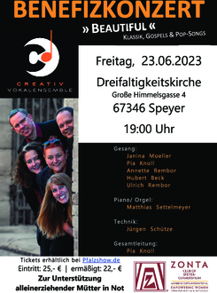Der Zonta Club Speyer-Germersheim lädt ein zu einem Benefizkonzert mit dem Vokalensemble „CREATIV“. Am Freitag, 23.06.23, um 19 Uhr präsentieren die fünf Creativen - unter der Leitung von Pia Knoll und begleitet von Matthias Settelmeyer - ihr Programm „BEAUTIFUL“. In der Dreifaltigkeitskirche in Speyer - mit der wundervollen Akustik - wird ein Querschnitt aus Klassik, Gospels und Popsongs das Publikum aufs Beste unterhalten.