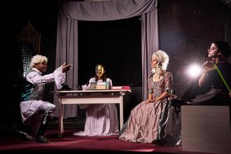 (V.l.n.r.) Alassane Traoré, Dorothea Cicatello, Silvia De Nigris, Alina Antonian in "LEBRECHT auf Seelenwanderung. Eine todernste Komödie". Premiere ist am Montag, den 23.06.2025.