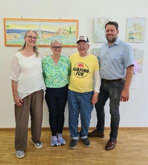 (V.l.n.r.:) KSB-Geschäftsführerin Nicole Fastabend, Organisatorin der Ausstellung Stephanie Mohr, Hobbymaler Dieter Marz, Leiter des Tourismusbüros Tobias Baumgärtner. Foto: SHöfer | Stadt Germersheim
