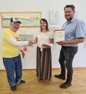 Auch die Mitarbeitenden des Tourismusbüro unterstützten die Spendenaktion des Hobbymalers Dieter Marz. Das Foto zeigt Stefanie Höfer und Tobias Baumgärtner bei der Spendenübergabe. Foto: SMohr | Stadt Germersheim