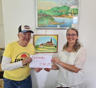 Hobbymaler Dieter Marz zusammen mit der KSB-Geschäftsführerin Nicole Fastabend bei der Spendenübergabe. Foto: SMohr | Stadt Germersheim