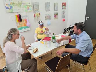 KSB-Geschäftsführerin Nicole Fastabend, Hobbymaler Dieter Marz und der Leiter des Tourismusbüros Tobias Baumgärtner beim gemütlichen Plausch mit Kaffee und Kuchen. Sie unterhielten sich angeregt über die hilfreichen Angebote des Kinderschutzbundes in Germersheim sowie über den Verlauf der Ausstellung. Foto: SMohr | Stadt Germersheim