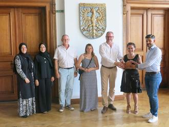Germersheims Bürgermeister Marcus Schaile (3.v.r.) und Yunus Erkök (ganz rechts), Vorsitzender des Beirats für Migration und Integration, überreichten HIPPY-Koordinatorin Monika Strehlau (2.v.r.) und den HIPPY-Mentorinnen Kristina Kessler, Nebiye Gültekin und Hanane Houat-Tawil im Beisein des stellvertretenden Büroleiters Ludwig Hans (3.v.l.) am Dienstag vergangener Woche den Integrationspreis 2023. Fotos: SNelles | Stadt Germersheim