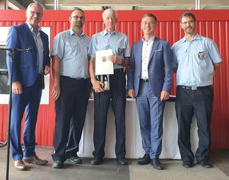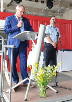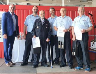 Bürgermeister Marcus Schaile bedankte sich u.a. auch beim Team Werbung und Öffentlichkeitsarbeit, besonders bei Florian Gassmann, beim Team Fahrzeugausstellung und Programm, besonders bei Josef Faugel, beim Team Historische Ausstellung, besonders bei Thomas Nährig, bei David Schröck für die Instandsetzung des historischen Fahrzeugs LF15 und bei Peter Walter für die Aufarbeitung der historischen Anhängeleiter sowie beim Förderverein Feuerwehr Germersheim, Christian Hillebrand und Günther Trauth sowie bei allen anderen Helferinnen und Helfer, Gönnern und Sponsoren!