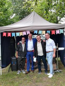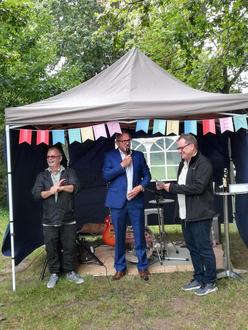 Alle Träger trugen auch zum Gelingen des Jubiläumsfestes sehr viel bei. Bei den Festreden begann Germersheims Bürgermeister Marcus Schaile und überreichte dem Koordinator des Stadtteilladens Klaus Strauß einen Zuschuss für die Arbeit des Stadtteilladens in Höhe von 200,00 Euro.