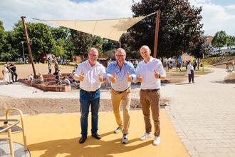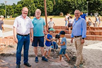 Sogleich gingen die ersten Kinder auf Entdeckungstour und erfreuten sich bei strahlendem Sonnenschein am Herzstück der Anlage: Barrierefreie und inklusive Spielgeräte, wie zum Beispiel den „Schaukel-Mix“, das rollstuhlgerechte Karussell, das Trampolin und der Wasserspielbereich mit Matschtisch und einem Sandbagger.