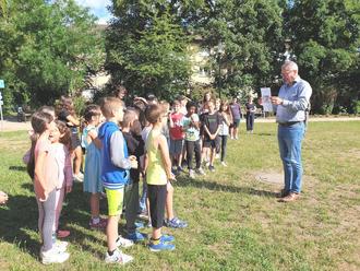 Bürgermeister Marcus Schaile gratulierte den Schulkindern der Klassen 2b, 4c und 4e der Eduard-Orth-Grundschule Germersheim zu ihrem großen Erfolg bei der Aktion "Ohne Auto sicher zur Schule". Er überreichte ihnen einen Gutschein über eine Stadt- und Festungsführung, über eine Nachenfahrt auf dem Altrhein und über eine Besichtigung der Wasserschutzpolizei mit Einsatzboot. Foto: Stephanie Mohr I Stadt Germersheim