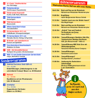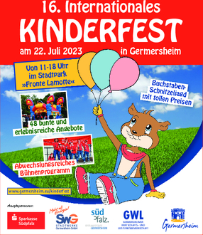 Am Samstag, dem 22. Juli 2023 feiert Germersheim im schönen Stadtpark Fronte Lamotte endlich wieder das mittlerweile 16. Internationale Kinderfest, zu dem alle „großen und kleinen Kinder“ sehr herzlich eingeladen sind. Mit 48 bunten und erlebnisreichen Angeboten verwandelt sich Germersheims Stadtpark Fronte Lamotte am 22. Juli von 11:00 Uhr – 18:00 Uhr im Rahmen des Kinderfestes zu einem riesigen und wunderbaren Spielplatz, auf dem alle ganz viel Spaß haben und toben können. Das Angebot reicht von Kinderschminken und Kinderflohmarkt über Bastelprogramme, Geschicklichkeitsspiele und Rätselaufgaben bis hin zur Free-Fall-Anlage, Bungee-Trampolinen und Riesenrutsche. Aber auch für das leibliche Wohl ist bestens gesorgt, und so können alle großen und kleinen Besucher zwischen Zuckerwatte, Waffeln, Obstsalat, Eis, marokkanischen/orientalischen Back- und Teigspezialitäten und Bratwürsten wählen. Auf der großen Show-Bühne bieten die örtlichen Vereine ein abwechslungsreiches Bühnenprogramm an. Bei den Tanz- und Musikaufführungen zeigen kleine und große Talente, was sie alles können. Unterstützt wird in diesem Jahr das Bühnenprogramm von dem Radiosender „Die neue Welle“. Dabei wird nicht nur tolle Musik gespielt, sondern der Moderator gibt interessierten Kindern auch gerne Antworten auf ihre Fragen zum Thema Radio.
