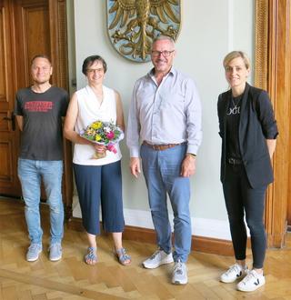 Verabschiedeten Beate Rupp ganz offiziell, mit großem Dank und mit herzlichen Wünschen in die Freistellungsphase im Rahmen der Altersteilzeit: Bürgermeister Marcus Schaile (2.v.r.), Büroleiterin Katrin Kunz (1.v.r.), stellvertretender Personalratsvorsitzender Andreas Kern (1.v.l.) und scheidende Leiterin der städt. Kindertagesstätte "Kinderland" Beate Rupp (2.v.l.).