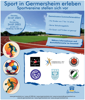 In einer gemeinsamen Aktion werden die Turnerschaft 1863 Germersheim e.V, der Germersheimer Fußballverein, der Tennisclub Germersheim, der VfR Sondernheim, der Tischtennisclub Germersheim und der Shotokan-Karate-Ryu Germersheim, unterstützt von der Stadt Germersheim, am 22.07.2025 bis zum 24.07.2025 in der Sporthalle der Geschwister-Scholl Grundschule und im Sportzentrum „Wrede“ ein Ferienangebot unter dem Motto „Sport in Germersheim erleben – Sportvereine stellen sich vor“ veranstalten. Das Angebot richtet sich an Kinder im Alter von 7 bis 14 Jahren und wird an allen drei Tagen in der Zeit von 10.00 bis 16.00 Uhr durchgeführt. An verschiedenen Spielstationen wurden folgende sportliche und kreative Wettbewerbe von den Vereinen zusammengestellt: