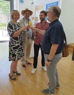 FTSK-Prodekanin Prof. Dr. Silvia Hansen-Schirra stößt mit Kolleg*innen auf eine sehr gelungene Vernissage an.