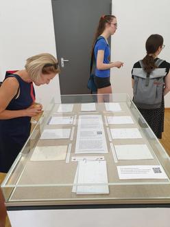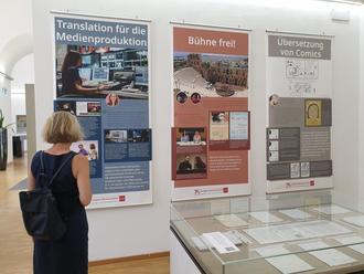 Große Plakate und zwei Glasvitrinen informieren die Besucher*innen über die "Translationsmomente".