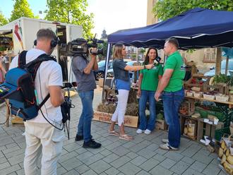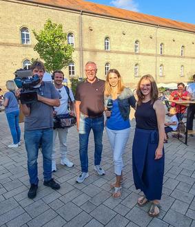 Die Sonne strahlte am vergangenen Feierabendmarkt um die Wette. SSWR-Reporterin Denise Schneider (2.v.r.) war mit ihrem Kamerateam ebenfalls vor Ort und sendete für SWR Aktuell Rheinland-Pfalz live vom Feierabendmarkt. Bürgermeister Marcus Schaile (Bildmitte) begrüßte das SWR-Team ganz herzlich und Citymanagerin Tami Ziegler (1.v.r) stand für ein Interview sehr gerne zur Verfügung.