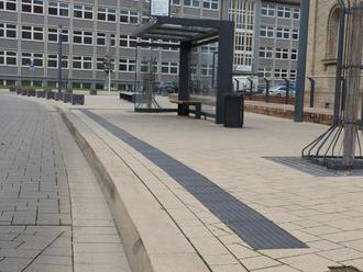 Die Bushaltestelle am Paradeplatz wurde bereits barrierefrei ausgebaut. Wie auf dem Foto zu sehen ist, sind die Bordsteine erhöht und zusätzlich ein Blindenleitsystem auf dem Gehweg installiert worden. Foto: Stephanie Mohr I Stadt Germersheim