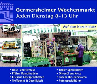 Der Wochenmarkt findet jeden Dienstag von 8 bis 13 Uhr statt. Angeboten werden leckere Putenspezialitäten, frische Bio-Produkte und Backwaren, Olivenöl aus Kreta, Tiroler Spezialitäten, schmackhafte Käsesorten, gesundes Obst- und Gemüse und original Pfälzer Dampfnudeln!