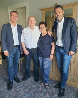 60 Jahre Seite an Seite durchs Eheleben: Die Eheleute Rita und Emil Seibert feierten am 18. Juli ihre Diamantene Hochzeit. Unter den zahlreichen Gratulanten waren der Erste Kreisbeigeordnete Christoph Buttweiler (inks im Bild) und der Erste Beigeordnete der Stadt Germersheim Dr. Sascha Hofmann (ganz rechts im Bild). Foto: SMohr I Stadt Germersheim