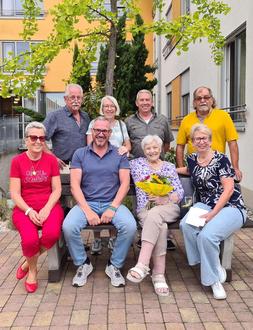 Altersjubilarin Inge Beutel, rechts sitzend neben Bürgermeister Marcus Schaile (2.v.links) feierte ihren 90. Geburtstag mit ihrer Tochter Silvia Krüger und deren Lebensgefährten Lorenz Ohlinger (hintere Reihe 1.v.rechts) und mit ihrem Sohn Ingo Ofer (hintere Reihe, 2.v.rechts) und dessen Ehefrau Heike Ofer (vordere Reihe 1.von links) sowie guten Bekannten. Foto: SMohr I Stadt Germersheim
