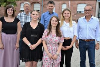 Bild: (vorne v.l.) Die Jugend- und Auszubildendenvertreterin Fabienne Spieß, Sophie Opfer, Emily Ehmer, Mia Dalinger (dahinter v.l.) der Personalratsvorsitzende Klemens Puderer, Büroleiter Ralph Lehr und Landrat Dr. Fritz Brechtel. Foto: Kreisverwaltung Germersheim/mda
