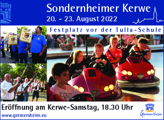 Nach nunmehr zwei Jahren Corona-Abstinenz, feiert rund um den 3. Sonntag im August Sondernheim im Jubiläumsjahr wieder traditionell seine bei Jung und Alt gleichermaßen beliebte „Kerwe". Veranstaltungsort für das viertägige Fest in der Zeit vom 20. bis 23. August 2022, ist der große Festplatz vor der Tulla-Schule. Die Kirchweih, bereits 1565 erwähnt, wird am Samstagabend um 18:30 Uhr mit dem traditionellen Fassbieranstich eröffnet. Zum Auftakt spielt der Fanfarenzug des Musikvereins 1959 Sondernheim e.V., welcher durch den festlichen Einzug und das Aufstellen des „Kerwebaums“ durch die „Sunnemer Briggewoochbuwe (un’ -mädle!)“ tatkräftig unterstützt wird. Nach dem „Anschießen der Kerwe“ mit drei donnernden Gewehrsalven des Schützenvereins 1957 Diana e.V., wird vom Verein Kulturgemeinde Sondernheim e.V. das von der Ottersheimer Brauerei „Bärenbräu“ gestiftete Eröffnungsfreibier an die anwesenden Gäste ausgeschenkt.