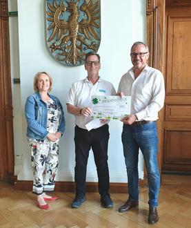 Bürgermeister Marcus Schaile und Ulrike Leiner, Leiterin des Kulturamts, bei der Übergabe des Spendenschecks in Höhe von 500.- Euro an Heinz Pollini (Bildmitte), Außenstellenleiter Südpfalz im Verein Weisser Ring. Foto: Stephanie Mohr I Stadt Germersheim