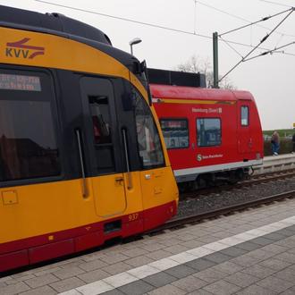 Die Stadtbahn S52 startet um 15:37 Uhr und 16:37 Uhr am Karlsruher Marktplatz (Pyramide U, Gleis 5) und fährt über den Albtal-Bahnhof und Wörth nach Germersheim.