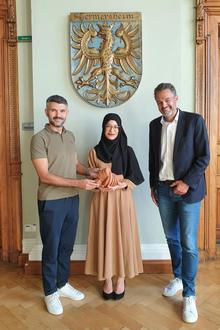 (V.r.n.l.) Erster Beigeordneter Dr. Sascha Hofmann, Büsra Lenz und Yunus Erkök bei der Preisverleihung am Donnerstag vergangener Woche. Foto: SMohr | Stadt Germersheim