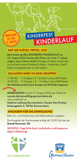 Anmeldung für den 1. Kinderlauf: Bis zum 17. August 2025 per E-Mail an nunzia.sferrazza@fcg-germersheim.de oder postalisch unter Stadtverwaltung Germersheim, Frauke Vos-Firnkes, Kolpingplatz 3 in 76726 Germersheim.