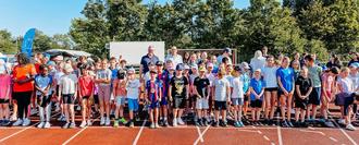 Startschuss zur Fit- und Fun-Woche: Bürgermeister Marcus Schaile stimmte sich mit den Kindern und Jugendlichen auf der Tartanbahn im Wrede-Stadion auf eine sportliche Woche ein. Fotos: NVongerichten | Stadt Germersheim