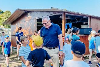 Bürgermeister Marcus Schaile im Gespräch mit den jungen Teilnehmerinnen und Teilnehmern der Fit- und Fun-Woche