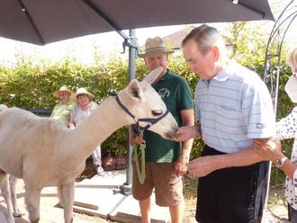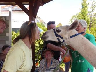 Die meisten Bewohner des Altenzentrums wollten die wolligen Klein-Kamele auch nur streicheln und füttern. „Aber zwei waren sehr mutig und haben sich getraut, eine Karotte in den Mund zu nehmen, die die Lamas ihnen dann ganz sanft abgenommen haben, um sie zu verspeisen“ so Fischer. „Lamas kann man ja auch nicht alle Tage küssen“, lacht sie. Auch die Mitarbeitenden des Altenzentrums hätten sich am Anblick von Cindy und Casy gefreut. „An dieses Erlebnis werden die Bewohner noch lange denken, so ein toller Besuch kommt ja nicht alle Tage im Altenzentrum vorbei.