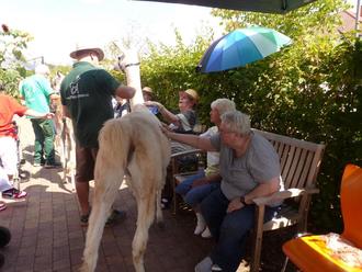 „Durch die corona-bedingten Einschränkungen konnten ja über längere Zeit einige soziale Aktivitäten nicht stattfinden, und deshalb wollten wir jetzt was Besonderes anbieten“, erzählt Kirstin Fischer, Bereichsleiterin der Sozialen Dienstes. „Die Idee zu den Lamas hatte dann Monika Meister von der sozialen Betreuung.“ Der flauschige Besuch sorgte bei den Bewohnern für eine spannende Abwechslung, sie waren begeistert von den tierischen Herzensöffnern. „Alle unsere Bewohner, die Lust auf eine Begegnung mit den Tieren hatten, kamen in den Garten. Die bettlägerigen Senioren wurden von den Lamas in den Zimmern besucht“, berichtet Fischer. Man habe im Caritas-Altenzentrum Erfahrung mit solchen Aktionen, denn: „Wir hatte schon vor längerer Zeit mal eine tierische Woche im Haus, da kamen jeden Tag andere Tiere zu Besuch.“ Da sei auch ein Pferd im Haus unterwegs gewesen, um zu den immobilen Bewohnern in die Zimmer zu gehen. Lamas seien aber das erste Mal da gewesen: „Es war sehr schön zu beobachten, wie vorsichtig die Lamas auf die Bewohner zugingen, so dass eine respektvolle Distanz gewahrt und gleichzeitig Vertrauen aufgebaut werden konnte“, so Fischer. „Auch unsere Einrichtungsleiterin Kim Lara Smetan war begeistert davon, dass die Bewohner so offen mit den Lamas umgegangen sind.“ So hätten ihr die Bewohner voller Freude erzählt, dass die Lamas sich streicheln ließen und ihr Fell so weich war.