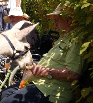 Die Bewohnerinnen und Bewohner freuten sich am flauschigen Fell der Gäste. Foto: Caritasverband für die Diözese Speyer / Kirstin Fischer