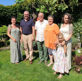 Strahlten mit der Sonne um die Wette ... Bürgermeister Marcus Schaile gratulierte dem Ehepaar Rüsenberg aus Germersheim (Bildmitte) zu seiner Goldenen Hochzeit recht herzlich. Im Kreise der Familie, unter anderem mit Tochter Daniela (links im Bild), Tochter Katja und Enkelin Elisabeth wurde dieser Jubeltag anschließend im heimischen Garten der Familie gebührend gefeiert.