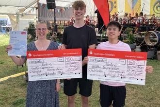 David und Connor nahmen bei der Preisverleihung zusammen mit Frau Frick am 23.06.2025 auf dem Marktplatz in Rheinzabern im Rahmen des Jubiläumsfests „100 Jahre Musikverein Lyra Rheinzabern e. V.“ die beiden Schecks stellvertretend für die Radelnden entgegen. Bürgermeister Schaile und Frau Johnston hatten im Vorfeld die Urkunden am Goethe-Gymnasium überreicht.