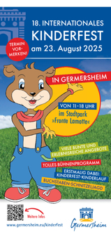 Am Samstag, dem 23. August 2025 in der Zeit von 11:00 - 18:00 Uhr feiert Germersheim ein weiteres Mal im schönen Stadtpark Fronte Lamotte sein mittlerweile 18. Internationales Kinderfest, zu dem alle „großen und kleinen Kinder“ sehr herzlich eingeladen sind.