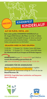 Anmeldung für den 1. Kinderlauf: Bis zum 22. August 2025 per E-Mail an nunzia.sferrazza@fcg-germersheim.de oder postalisch unter Stadtverwaltung Germersheim, Frauke Vos-Firnkes, Kolpingplatz 3 in 76726 Germersheim oder aber am Tag des Kinderfestes selbst, und zwar am Stand mit der Nummer 20 ab 10.30 Uhr.