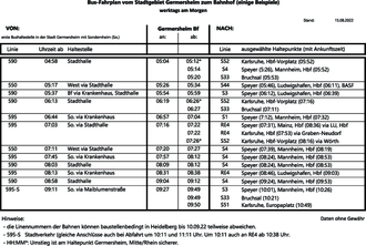 „Zwischenzeitlich wurde mir öfters die Frage gestellt, ob wir auch bessere Anschlüsse nach Speyer, Annweiler etc. schaffen konnten“ berichtet Bürgermeister Marcus Schaile. Deswegen hat er seiner Verwaltung den Auftrag erteilt, etwas mehr Einblick in das neue ÖPNV-Angebot in der Stadt Germersheim zu geben, was wir in enger Zusammenarbeit mit der Kreisverwaltung Germersheim „auf die Räder“ gestellt haben. Das Ergebnis dieser Arbeit wurde unter anderem tabellarisch aufbereitet. Es enthält einige Beispiele für Umstiege am Bahnhof Germersheim von mehreren Buslinien auf die Bahnverbindungen in Richtung Speyer, Graben-Neudorf bzw. Bruchsal und Karlsruhe.